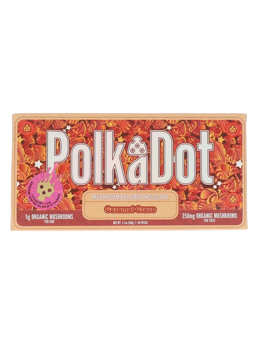 Satisfy your sweet tooth with the luscious combination of buttery caramel and smooth Belgian milk chocolate in Caramel Crave PolkaDot. Each piece contains 250mg of organic mushrooms. The bar offers a serving size of 2 pieces, with 10 servings per bar, making it easy to manage your dosage for the desired effect.