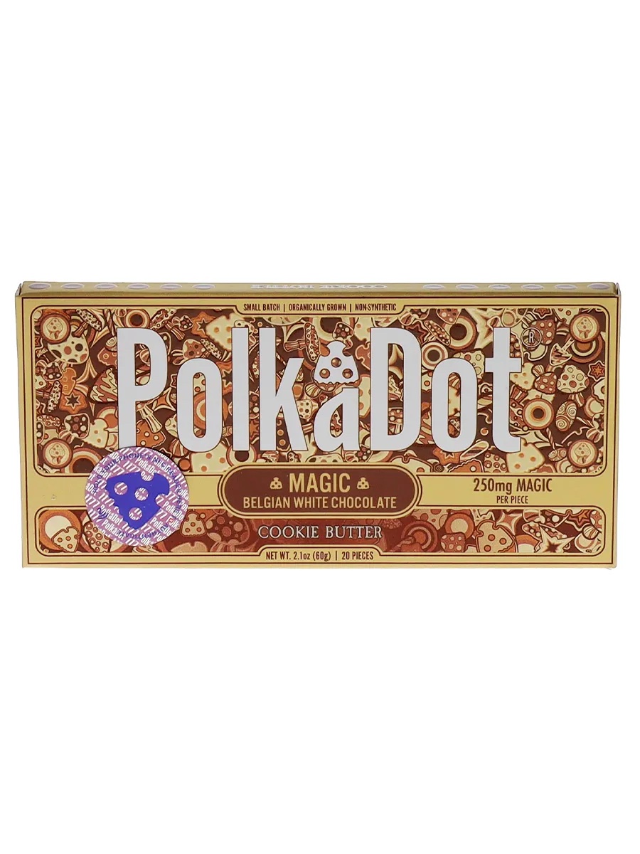 Treat yourself to the warm, spiced flavors of cookie butter blended into creamy Belgian white chocolate. With hints of cinnamon, caramelized sugar, and buttery goodness, Cookie Butter PolkaDot Magic Mushroom Belgian White Chocolate delivers an irresistibly rich and comforting experience. Infused with 250mg of magic mushrooms, it provides a euphoric lift while delighting your taste buds with a nostalgic cookie-inspired taste. The smooth texture and balanced spice make it an inviting choice for those who love dessert-like treats with a psychedelic twist