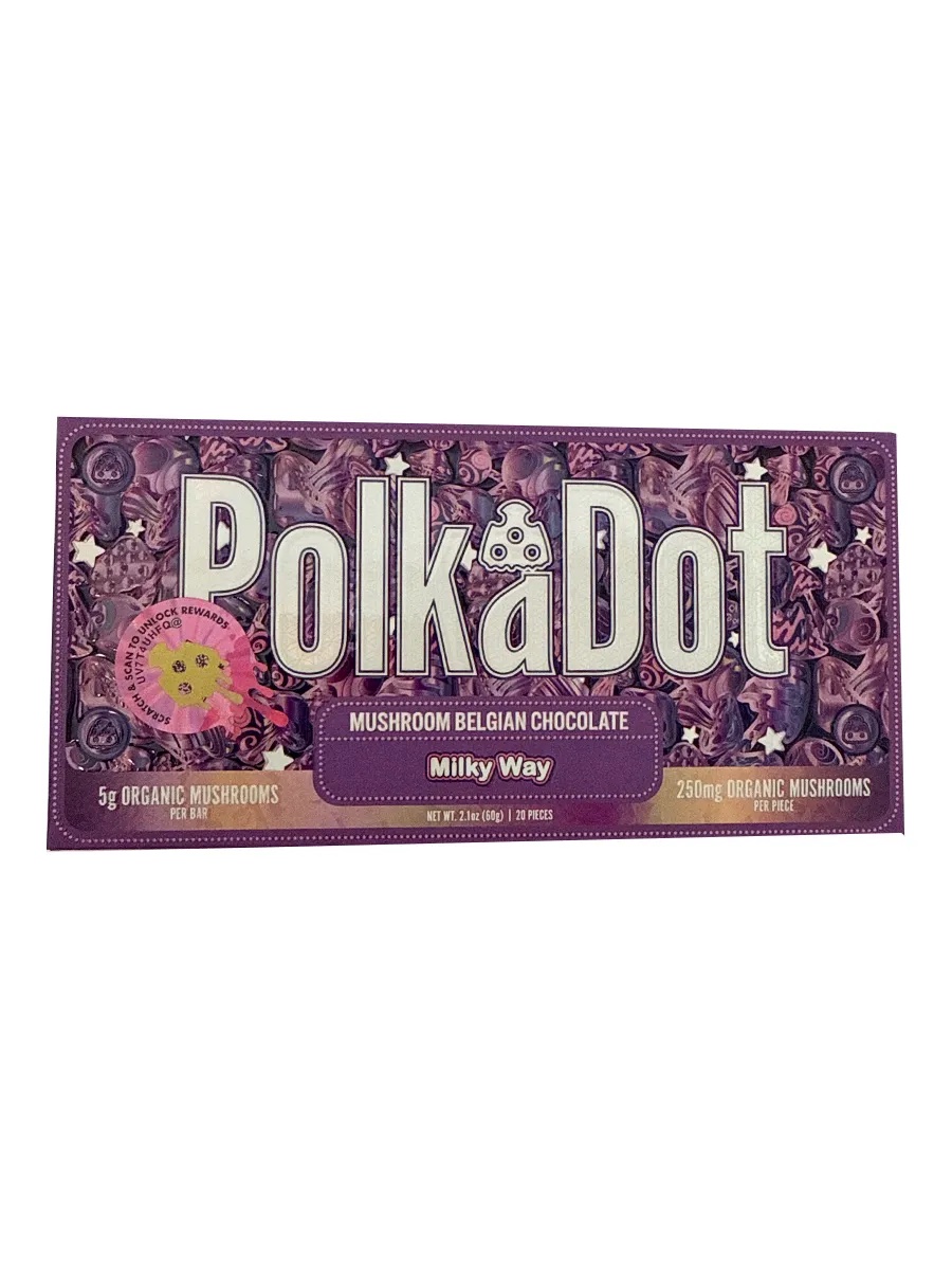 Milky Way PolkaDot offers a creamy, smooth flavor that blends well with 250mg of organic mushrooms in each piece. With ten servings per bar and two pieces per serving, it’s easy to keep track. This sweet and light chocolate bar is ideal for those who enjoy soft, milky flavors. It supports a calm mind and smooth flow, great for daytime use or when you want a gentle effect.