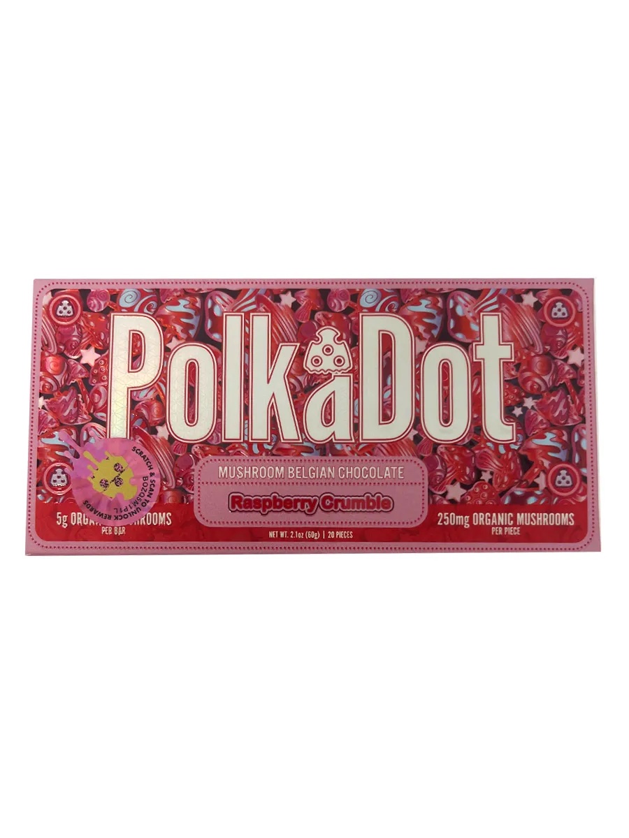 Sweet and smooth, the Raspberry Crumble PolkaDot bar offers a mix of creamy Belgian white chocolate and tart raspberry flavor. Each piece contains 250mg of organic magic mushrooms, making it easy to portion and control your experience. With ten servings per bar and two pieces per serving, you get both great taste and steady effects. The flavor is soft, fruity, and slightly tangy, ideal for those who enjoy a sweet, calming experience with a mild, balanced edge.